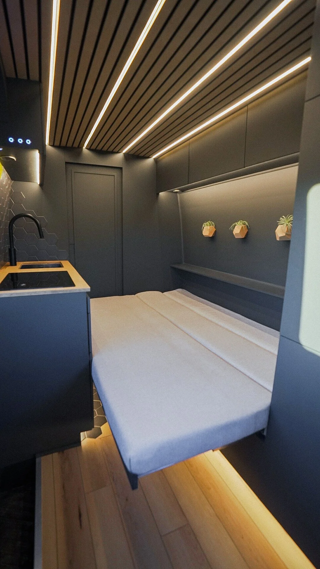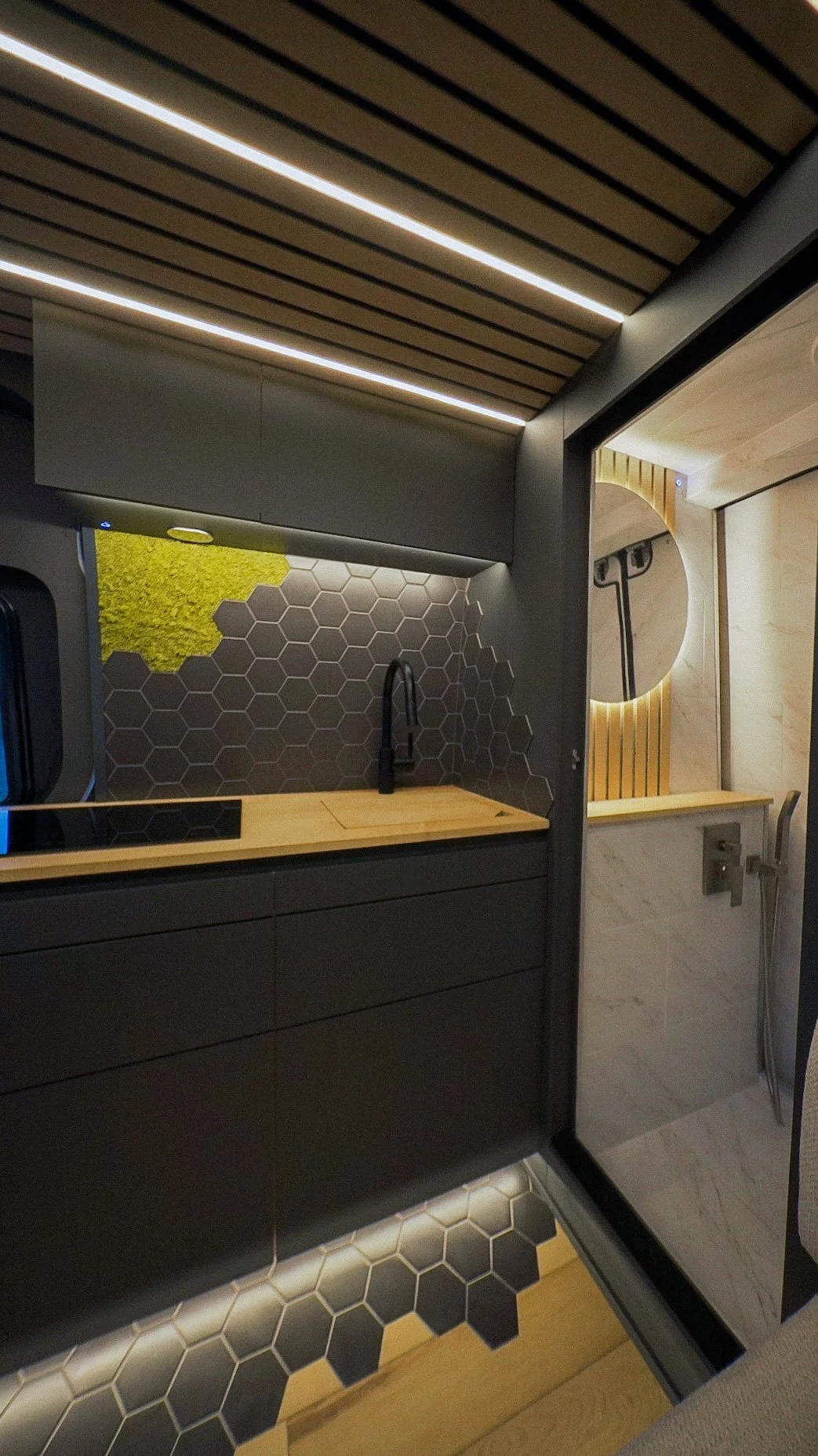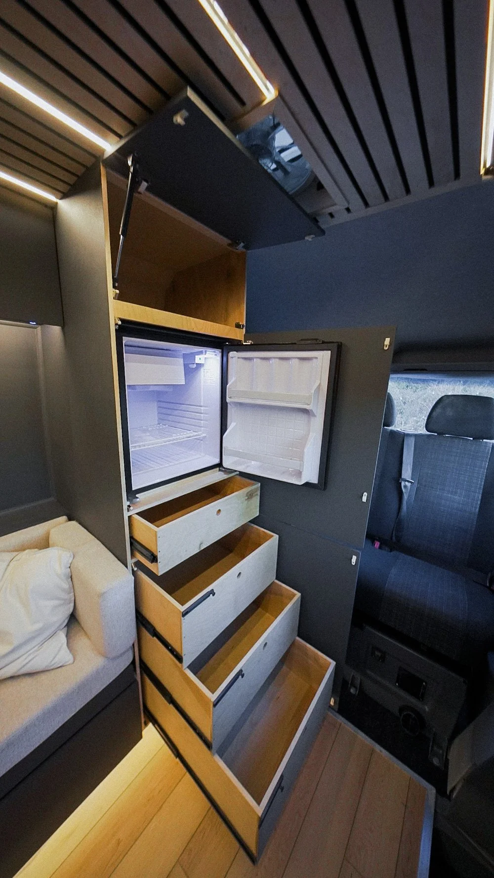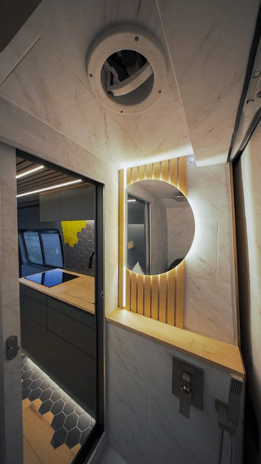We brought the Dark Build back for a 3rd time with a new twist. We wanted to push the boundaries of what you can get inside of a medium wheelbase van and included a large back bathroom and some storage in the back of the van. This concept was intended to provide the luxuries of home such as a separate enclosed bathroom space while maintaining the modern apartment feel as well as the stealth and mobility of a smaller van.