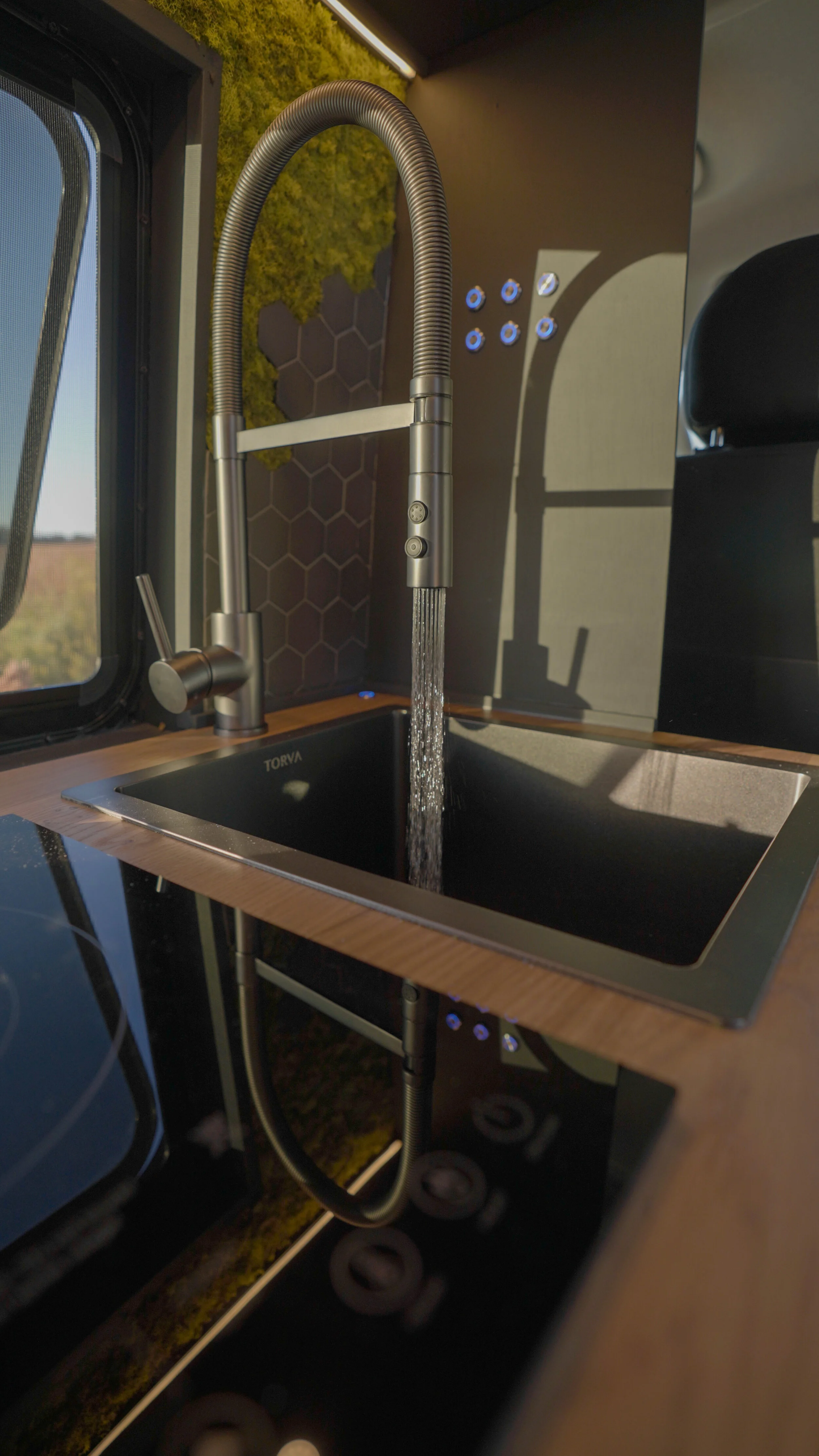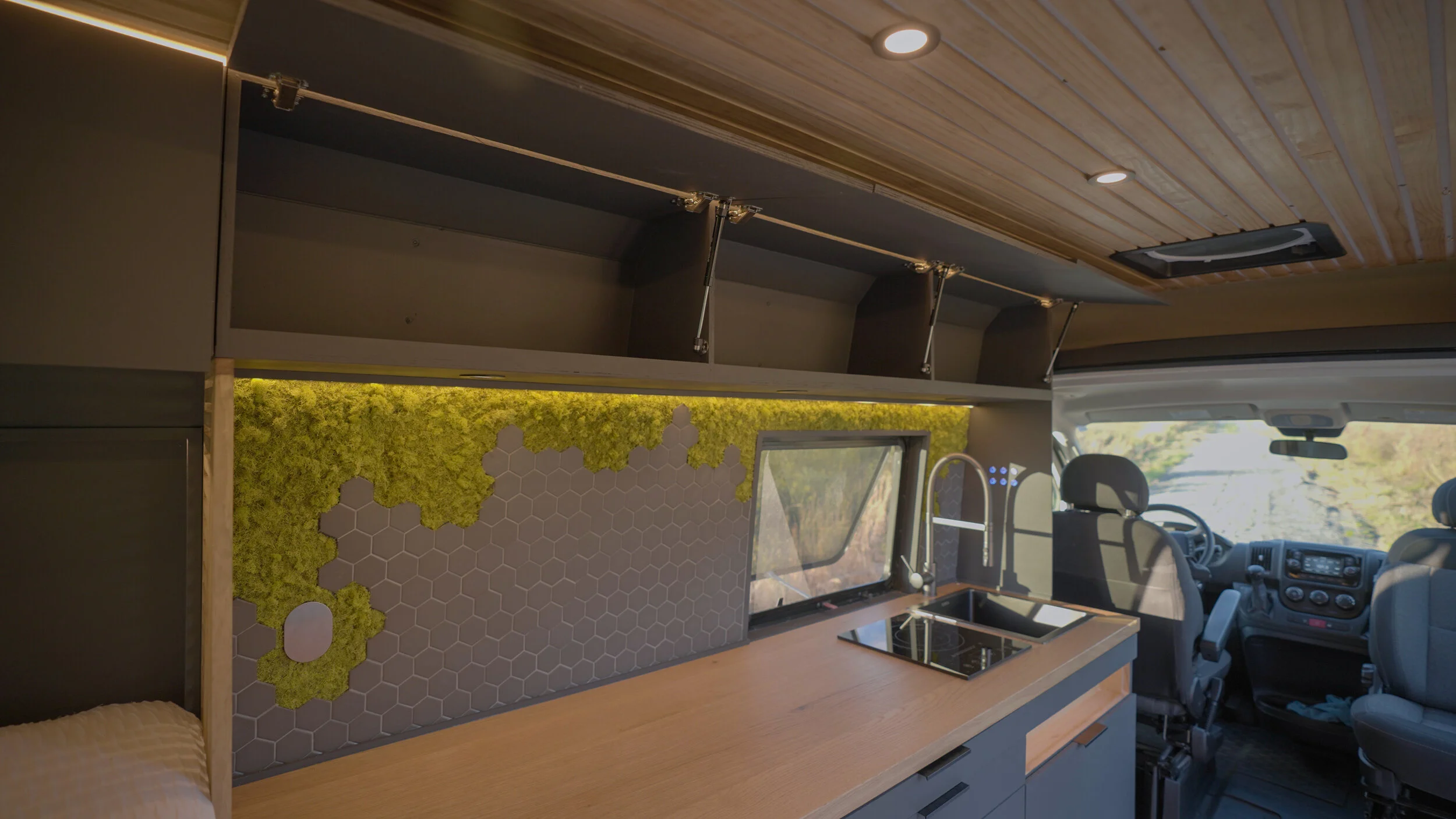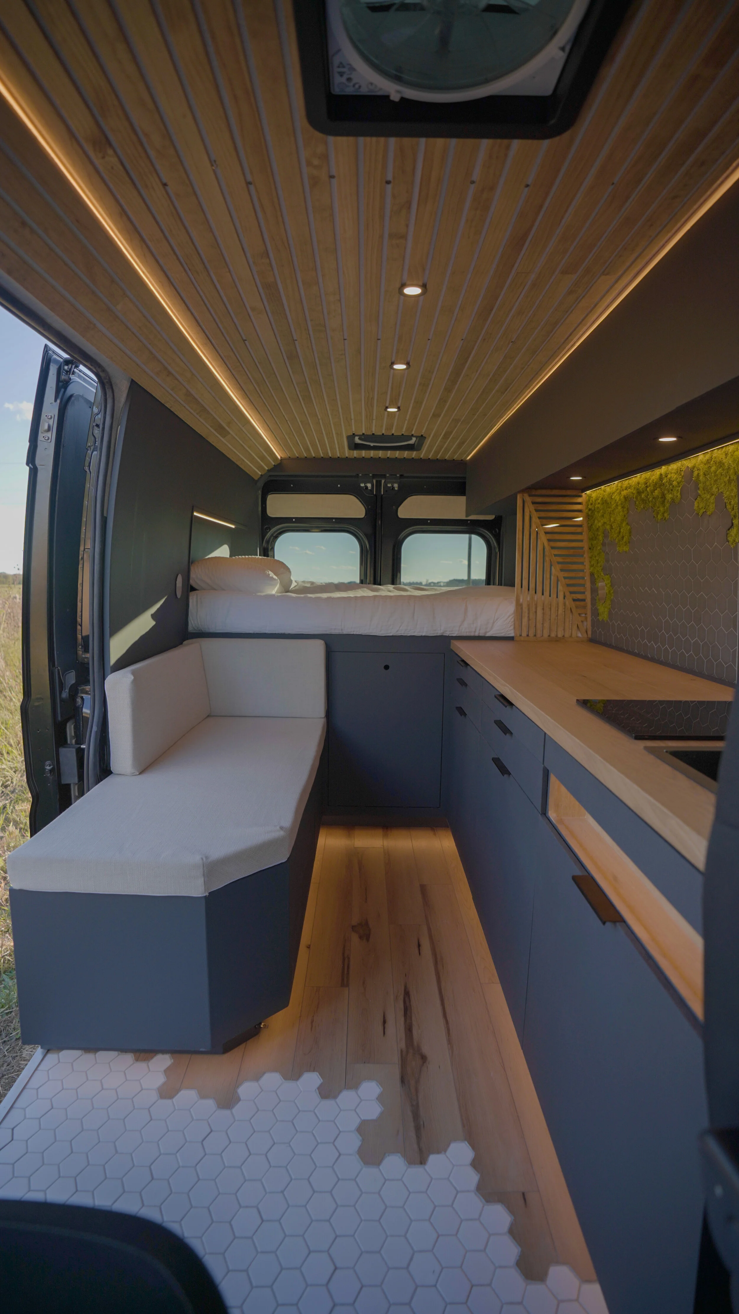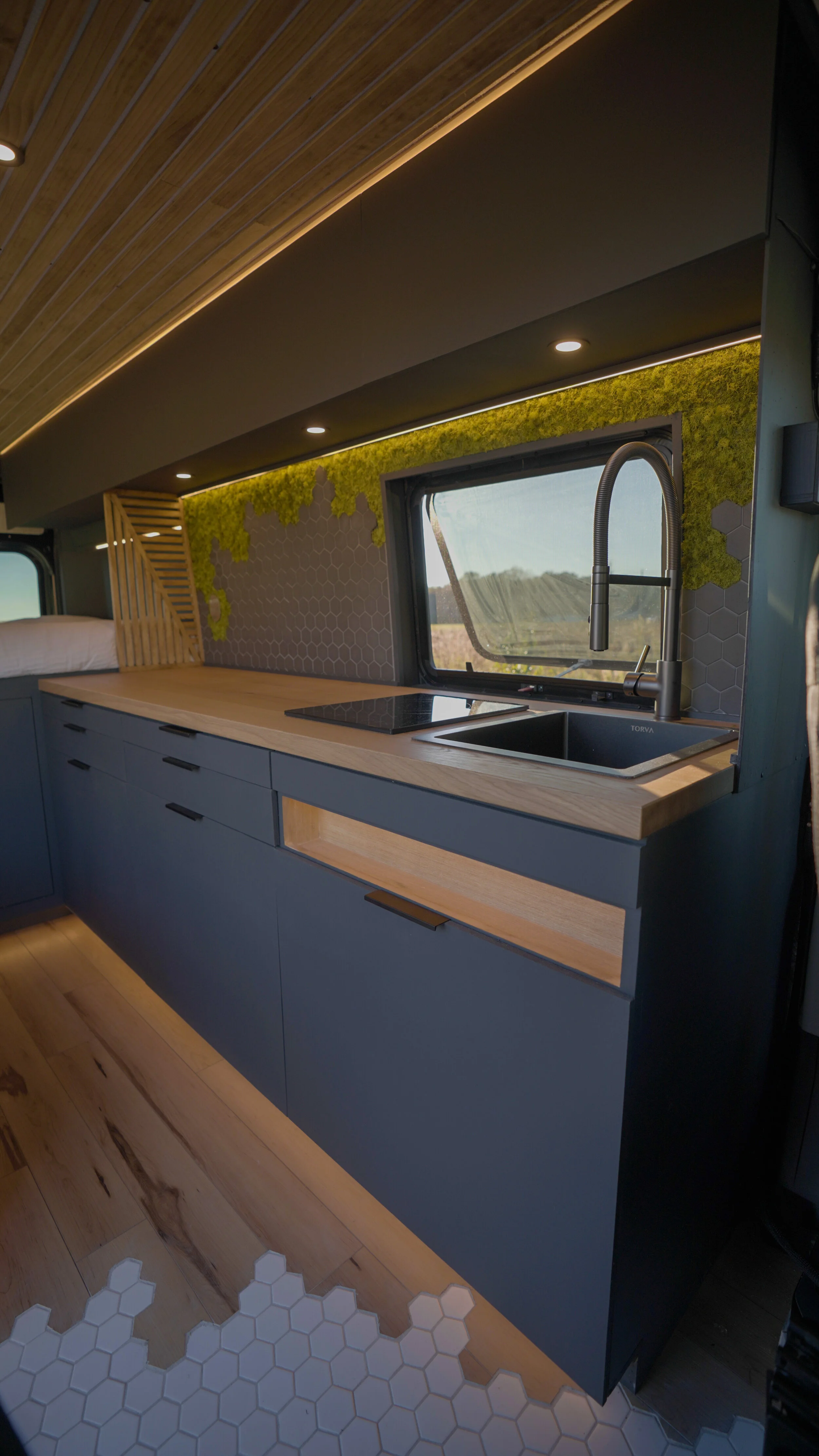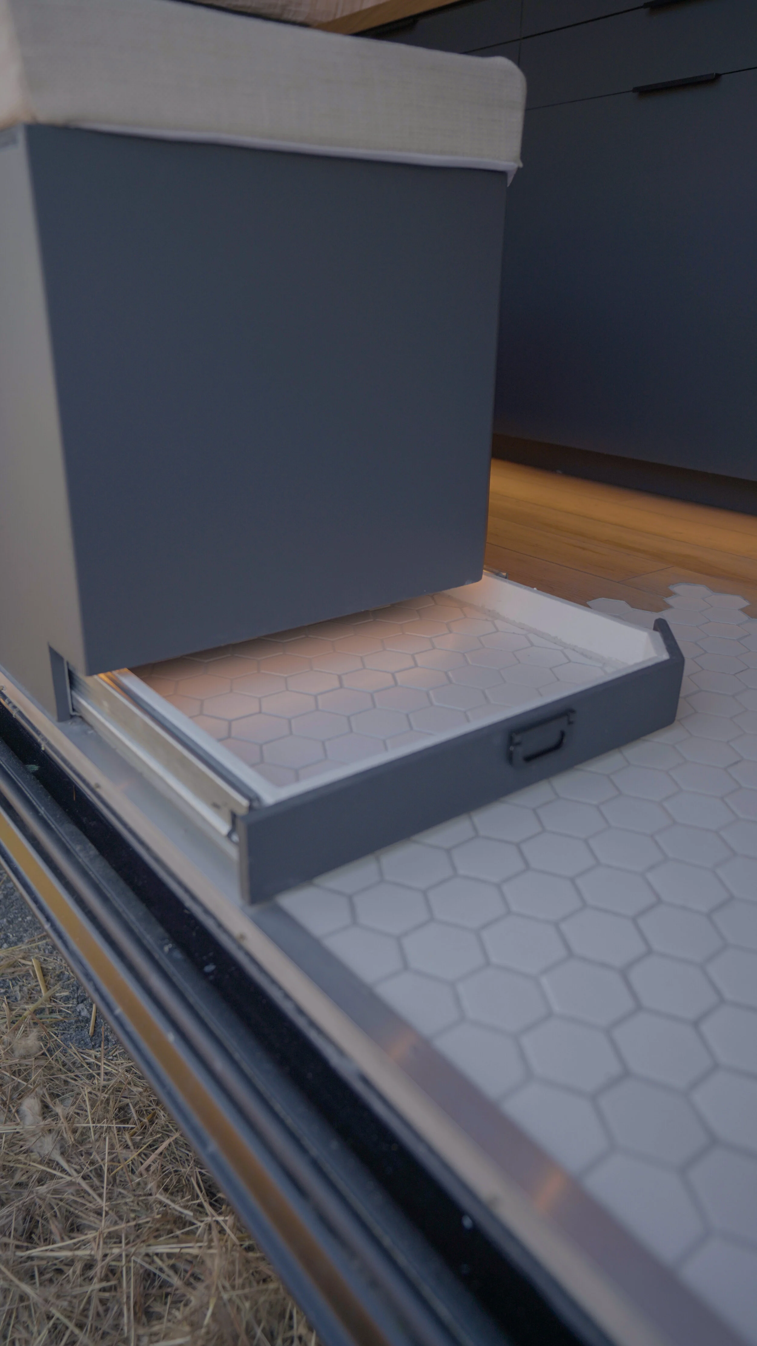 Jensen was a design concept that had been on the drawing board for a while. Although this hyper-modern dark theme definitely challenged the norm, it was just enough out of our comfort zones to keep things new and exciting. One of our favorite features of this build was the self-contained, hidden shower pan that pulled out from a drawer in the toe kick. Needless to say, Jensen changed the game and was a total dream come true.